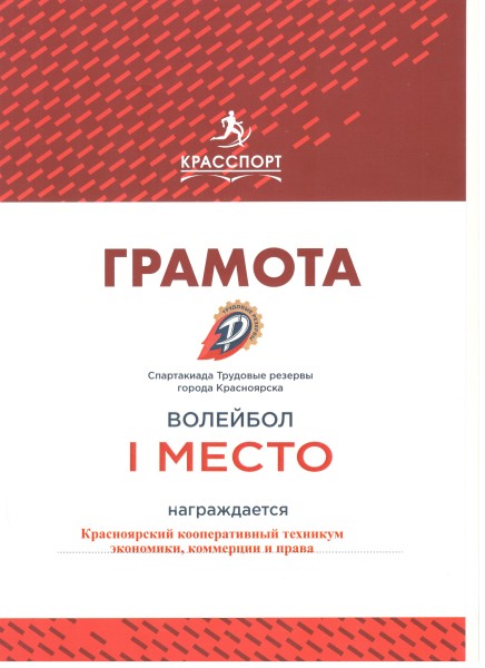 Под руководством преподавателей Черепахина Дениса Владиславича и Попова Владимира Ивановича, в рамках успешно функционирующей на базе техникума Местной общественной организации «Физкультурно-спортивный клуб Трудовые резервы «ЧПОУ Красноярский кооперативный техникум экономики, коммерции и права», женская команда техникума завоевала 1 место по Волейболу в Спартакиаде Трудовые резервы города Красноярска среди трудовых коллективов проводимой Красноярским краевым региональным отделением общероссийской общественной организации «Всероссийское физкультурно-спортивное общество «Трудовые резервы». Физкультурно-спортивный клуб Трудовые резервы «ЧПОУ Красноярский кооперативный техникум экономики, коммерции и права» эффективно работает в сфере пропагандирования здорового образа жизни и качественной интересной физической активности.