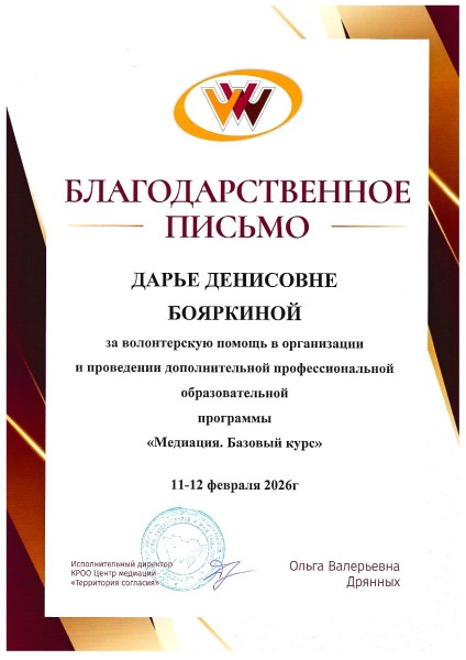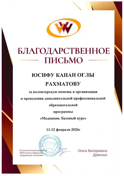 Обучающиеся техникума Телевка Ксения Денисовна, Рахматов Юсиф Канан оглы, Сукиасян Давид Гарегинович и Бояркина Дарья Денисовна награждены Благодарственными письмами КРОО Центр медиации «Территория согласия» за волонтерскую помощь в организации и проведении дополнительной профессиональной образовательной программы «Медиация. Базовый курс»