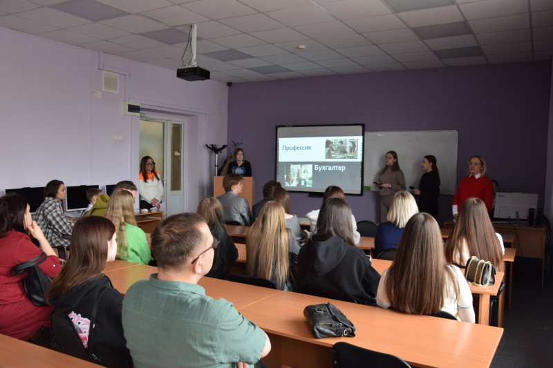 Специальность 38.02.01 Экономика и бухгалтерский учет (по отраслям) представили преподаватель Евтягина Н.Д. и студенты группы Б-2 Самарина Е., Макелько И., Басалаева М. и Пошепчинская С. Гостям была показана презентация по специальности и проведена игра «Управляй своим бизнесом» с использованием специальных бухгалтерских терминов.