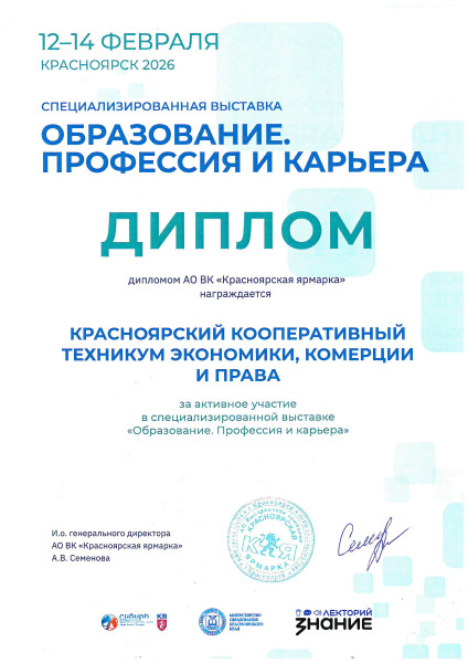 По итогам активного участия техникум награжден Дипломом АО ВК «Красноярская ярмарка» за активное участие в специализированной выставке «Образование. Профессия и карьера».