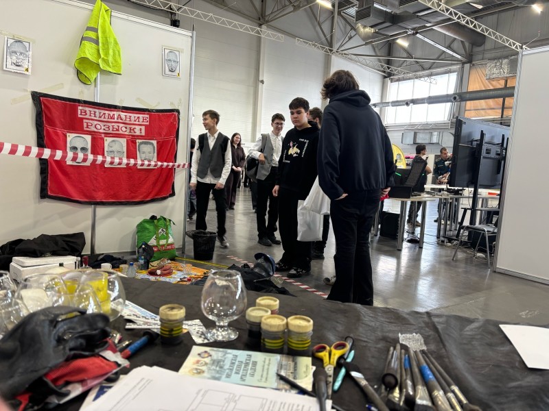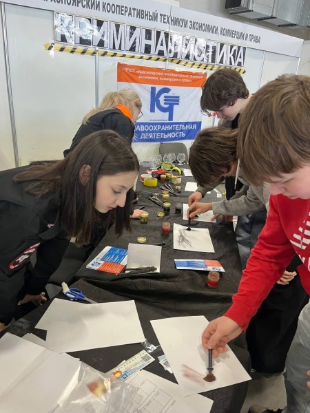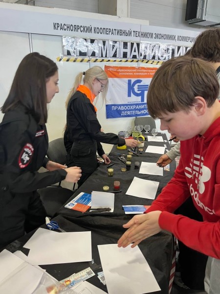 А на площадке специальности 40.02.02 Правоохранительная деятельность студенты Михайлов А. (гр. ПДМ-3), Утенкова Д. (гр. ПДМ-2), Фукс А., Приходько В. (гр. ПДЛ-3), Морякина Е., Муравьёва М., Бородина Я., Зайнулина А, Норбоева Ж., Журавлёва К, Калетина В., Хачатрян А. (гр. ПДЛ-2) знакомили школьников с современными тенденциями в криминалистике, учили обследовать место преступления, изымать следы преступления, снимать отпечатки пальцев и обуви и проводили мастер-класс по снятию отпечатков пальцев.