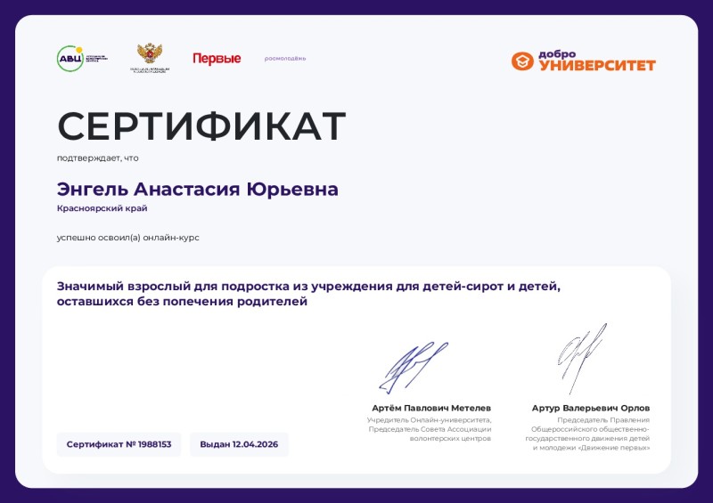 Преподаватель техникума Энгель Анастасия Юрьевна прошла обучение в Доброуниверситете при поддержке Росмолодёжи, Движения Первых, Министерства просвещения Российской Федерации и Ассоциации волонтёров России по программе «Значимый взрослый для подростка из учреждения для детей‑сирот и детей, оставшихся без попечения родителей». По итогам обучения ей был выдан сертификат, подтверждающий освоение курса и готовность применять полученные знания в практической работе с несовершеннолетними.
