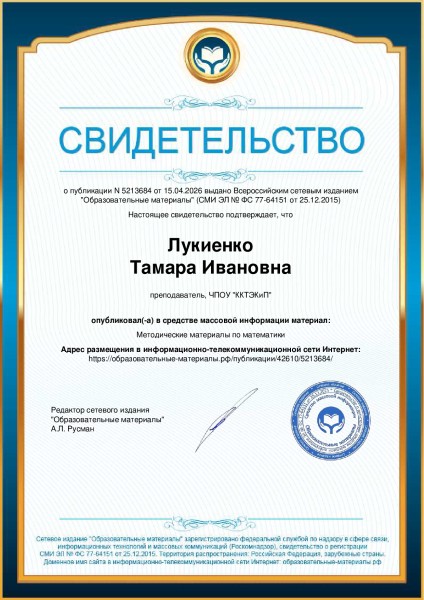 Преподаватель техникума Лукиенко Тамара Ивановна опубликовала дидактические материалы по математике по теме «Основы линейной алгебры» и методические материалы по «Математике» на портале СМИ «Образовательные материалы»