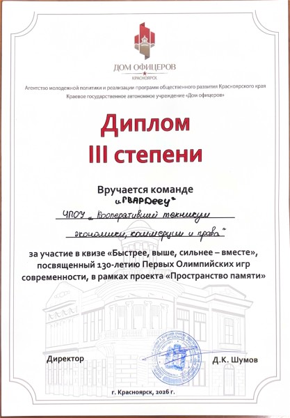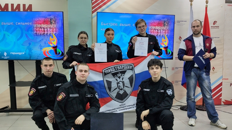 Под руководством преподавателя Викторова Андрея Александровича студенты участники военно-патриотического отряда техникума «Гвардеец» в Доме офицеров среди восьми команд, представляющих школы, средние специальные и высшие учебные заведения Красноярского края, а также Координационный молодежный совет правоохранительных органов Красноярского края на протяжении 5 разнообразных игровых туров состязались в знании истории Олимпийских игр современности и спортивных достижений наших соотечественников.