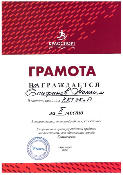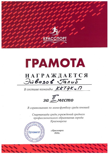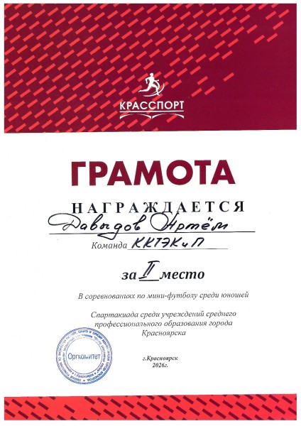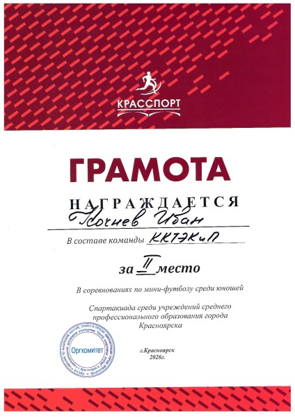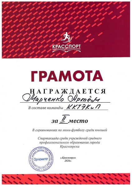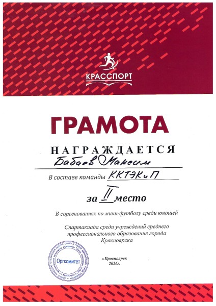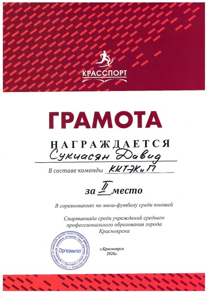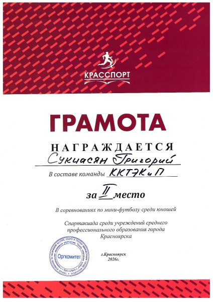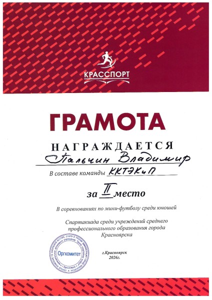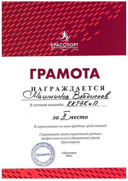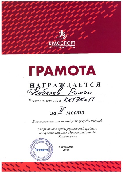 Команда обучающихся ЧПОУ «Красноярский кооперативный техникум экономики, коммерции и права» в составе Бабаев Максим гр. ЮАА-2, Давыдов Артём гр. ЮА 1(2), Епифанов Максим гр. ПДЗ-3, Кочнев Иван гр. ПДЛ-3, Кобелев Роман гр. ТГ 2(3), Марченко Артём гр. ПДИ-2, Машников Владислав гр. ПДИ-2, Сукиасян Давид гр. ТД-1, Сукиасян Григорий гр. ЮАА-3, Пальчин Владимир гр. ПДД-2(3), Эйвазов Галиб гр. ПДЗ-3 под руководством преподавателя физической культуры Мозгуновой Анастасии Павловны состязалась с 23 командами нашего города в упорной, тяжелой борьбе и завоевала 2 место в соревнованиях по Мини-футболу среди юношей в рамках Спартакиады среди учреждений среднего профессионального образования г. Красноярска проводимых Главным управлением по физической культуре спорту и туризму Администрации г. Красноярска