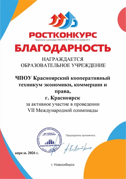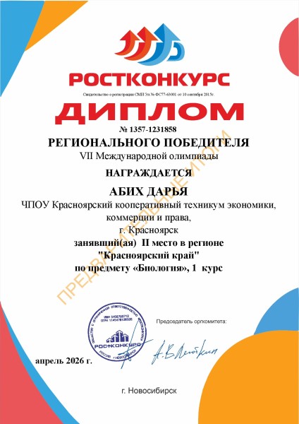 Абих Дарья 2 место VII Международная олимпиада по предмету Биология в регионе Красноярский край проводимая СМИ «Ростконкурс»