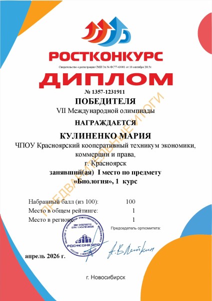 Кулиненко Мария 1 место VII Международная олимпиада по предмету Биология в регионе Красноярский край проводимая СМИ «Ростконкурс»