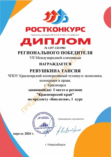 Ревушкина Таисия 1 место VII Международная олимпиада по предмету Биология в регионе Красноярский край проводимая СМИ «Ростконкурс»
