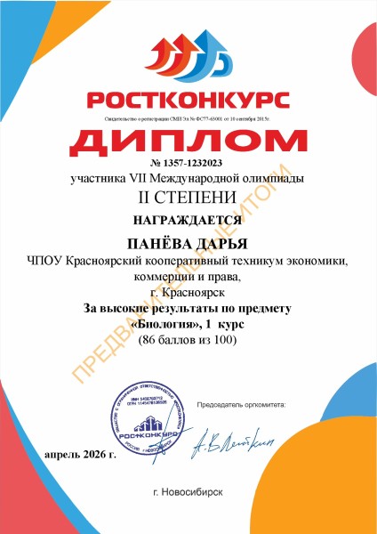 Панёва Дарья 2 место VII Международная олимпиада по предмету Биология проводимая СМИ «Ростконкурс»