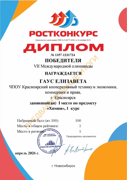 Гаус Елизавета 1 место VII Международная олимпиада по предмету Химия в регионе Красноярский край проводимая СМИ «Ростконкурс»