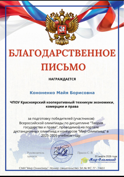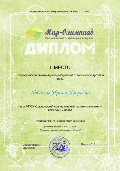 Педасюк Ирина 2 место Всероссийская олимпиада по дисциплине «Теория государства и права» проводимая СМИ «Мир Олимпиад»