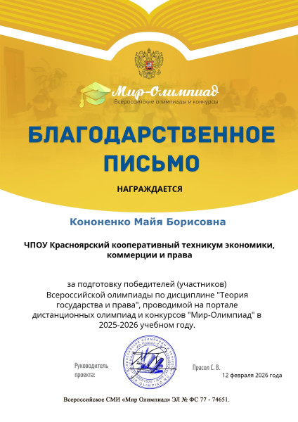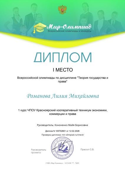 Романова Лилия 1 место Всероссийская олимпиада по дисциплине «Теория государства и права» проводимая СМИ «Мир Олимпиад»