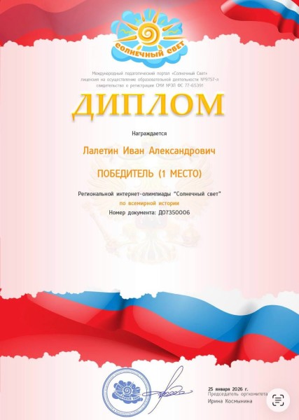 Лалетин Иван 1 место Международная интернет-олимпиада по Всемирной истории для студентов проводимая СМИ «Солнечный свет»