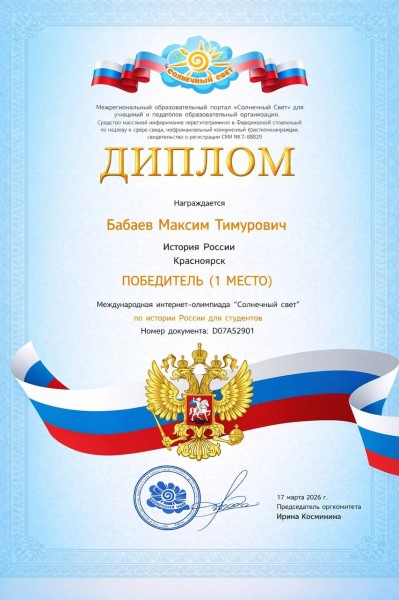 Бабаев Максим 1 место Международная интернет-олимпиада по Истории России для студентов проводимая СМИ «Солнечный свет»