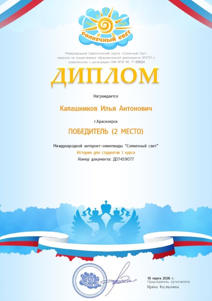 Калашников Илья 2 место Международная интернет-олимпиада по Истории для студентов 1 курса проводимая СМИ «Солнечный свет»