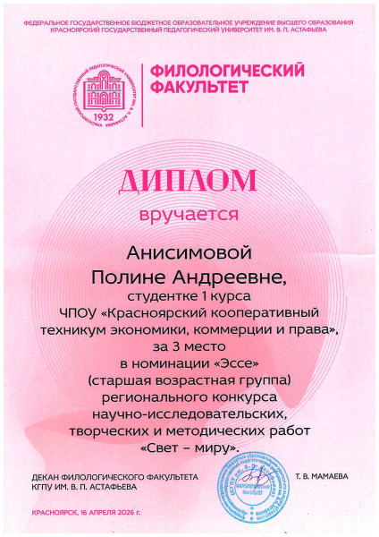 Анисимова Полина 3 место Региональный конкурс научно-исследовательских, творческих и методических работ «Свет - миру» номинация «Эссе» (старшая возрастная группа) проводимый ФГБОУВО «Красноярский государственный педагогический университет им. В.П. Астафьева»