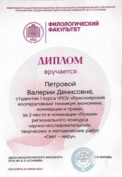 Петрова Валерия 2 место Региональный конкурс научно-исследовательских, творческих и методических работ «Свет - миру» номинация «Поэзия» проводимый ФГБОУВО «Красноярский государственный педагогический университет им. В.П. Астафьева»