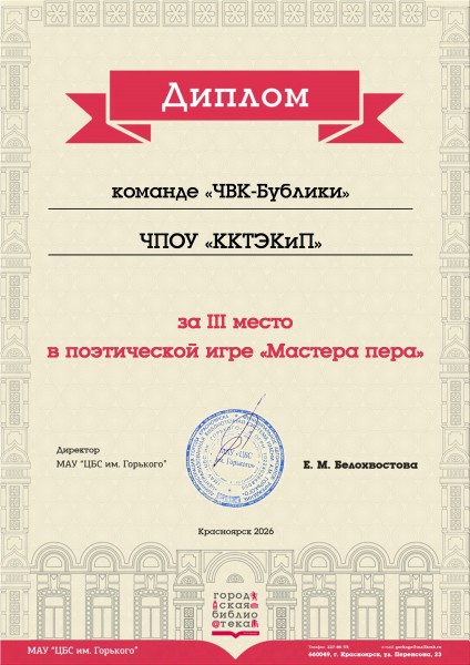 «ЧВК-Бублики» 3 место поэтическая игра «Мастера пера» проводимая МАУ «ЦБС им. Горького»