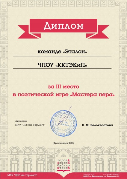 «Эталон» 3 место поэтическая игра «Мастера пера» проводимая МАУ «ЦБС им. Горького»