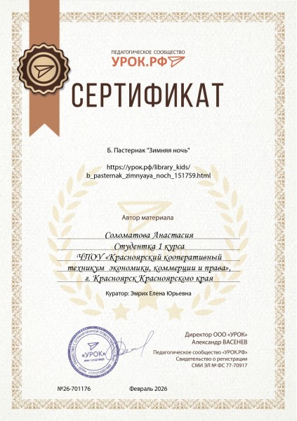 Соломатова Анастасия материал «Б. Пастернак «Зимняя ночь» на портале ООО «Урок»