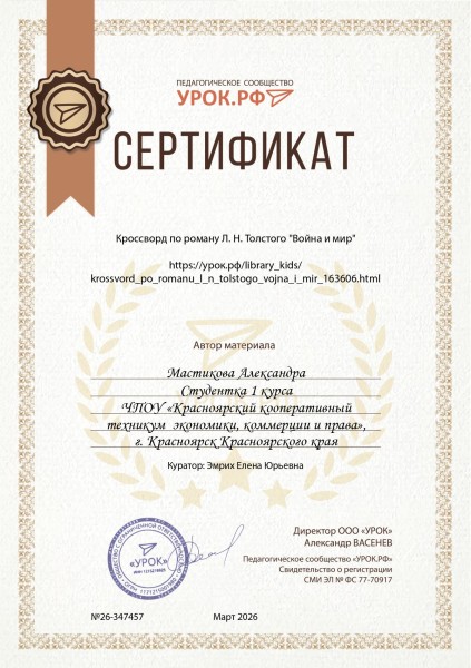 Мастикова Александра материал «Кроссворд по роману Л.Н. Толстого «Война и мир» на портале ООО «Урок»