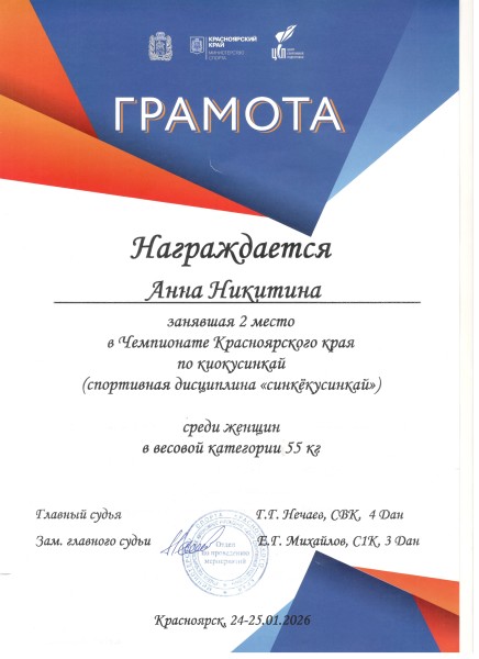 2 место в Чемпионате Красноярского края по Киокусинкай (спортивная дисциплина «синкёкусинкай») среди женщин в весовой категории 55 кг. проводимом Министерством спорта Красноярского края