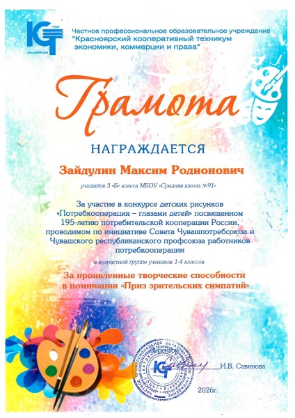 Зайдулин Максим Родионович, учащийся 3 «Б» класса МБОУ «Средняя школа №91» награжден Грамотой Частного профессионального образовательного учреждения «Красноярский кооперативный техникум экономики, коммерции и права» за участие в конкурсе детских рисунков «Потребкооперация – глазами детей» посвященном 195-летию потребительской кооперации России, проводимом по инициативе Совета Чувашпотребсоюза и Чувашского республиканского профсоюза работников потребкооперации в возрастной группе учеников 1-4 классов за проявленные творческие способности в номинации «Приз зрительских симпатий»