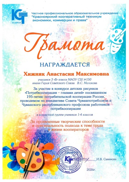 Хижняк Анастасия Максимовна, учащаяся 3 «Б» класса МАОУ СШ №150 имени Героя Советского Союза В.С. Молокова награждена Грамотой Частного профессионального образовательного учреждения «Красноярский кооперативный техникум экономики, коммерции и права» за участие в конкурсе детских рисунков «Потребкооперация – глазами детей» посвященном 195-летию потребительской кооперации России, проводимом по инициативе Совета Чувашпотребсоюза и Чувашского республиканского профсоюза работников потребкооперации в возрастной группе учеников 1-4 классов за проявленные творческие способности и оригинальность подхода к теме труда и жизни кооператоров