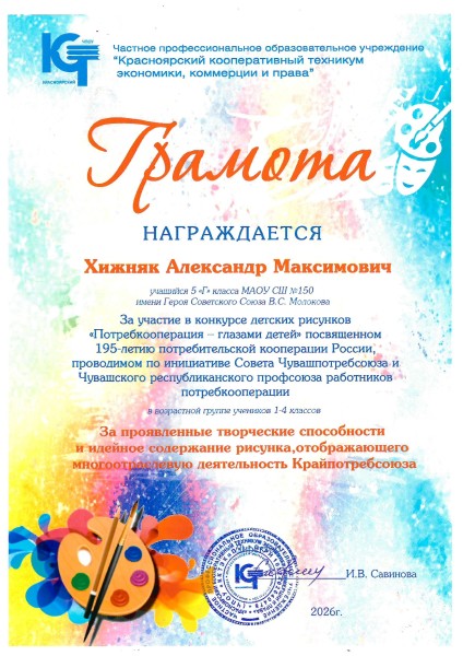 Хижняк Александр Максимович, учащийся 5 «Г» класса МАОУ СШ №150 имени Героя Советского Союза В.С. Молокова награжден Грамотой Частного профессионального образовательного учреждения «Красноярский кооперативный техникум экономики, коммерции и права» за участие в конкурсе детских рисунков «Потребкооперация – глазами детей» посвященном 195-летию потребительской кооперации России, проводимом по инициативе Совета Чувашпотребсоюза и Чувашского республиканского профсоюза работников потребкооперации в возрастной группе учеников 5-11 классов за проявленные творческие способности и идейное содержание рисунка, отображающего многоотраслевую деятельность Крайпотребсоюза