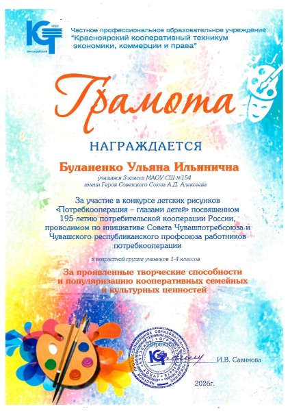 Буланенко Ульяна Ильинична, учащаяся 3 класса МАОУ СШ №154 имени Героя Советского Союза А.Д. Алексеева награждена Грамотой Частного профессионального образовательного учреждения «Красноярский кооперативный техникум экономики, коммерции и права» за участие в конкурсе детских рисунков «Потребкооперация – глазами детей» посвященном 195-летию потребительской кооперации России, проводимом по инициативе Совета Чувашпотребсоюза и Чувашского республиканского профсоюза работников потребкооперации в возрастной группе учеников 1-4 классов за проявленные творческие способности и популяризацию кооперативных семейных и культурных ценностей