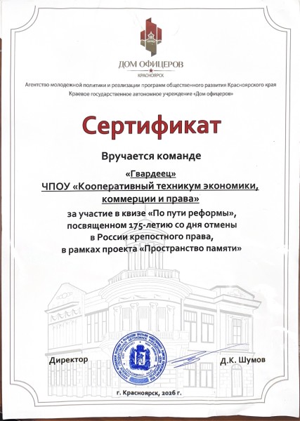 Под руководством преподавателя Викторова Андрея Александровича студенты участники военно-патриотического отряда техникума «Гвардеец» приняли участие в Квизе «По пути реформы», посвященном 175-летию со дня отмены в России крепостного права проводимом в Доме офицеров Агентством молодежной политики и реализации программ общественного развития Красноярского края и Краевым государственным автономным учреждением «Дом офицеров» в рамках проекта «Пространство памяти». В квизе соревновались семь команд, представляющих школы, средние специальные и высшие учебные заведения Красноярского края, а также Координационный молодежный совет правоохранительных органов Красноярского края. На протяжении шести разнообразных игровых туров участники состязались в знании истории праздника.